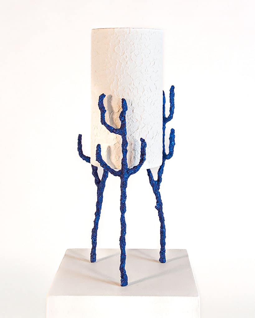 Réalisée à partir de boîtes de papier recyclé et entièrement fabriquée à la main dans son atelier à Eymet, chaque création allie la rigueur du fil de fer à la sensualité organique du papier mâché. Les armatures métalliques, imaginées par Pascal, se lovent sous des couches superposées de papier, tantôt brut, tantôt pigmenté, révélant un univers imaginaire et sensible.