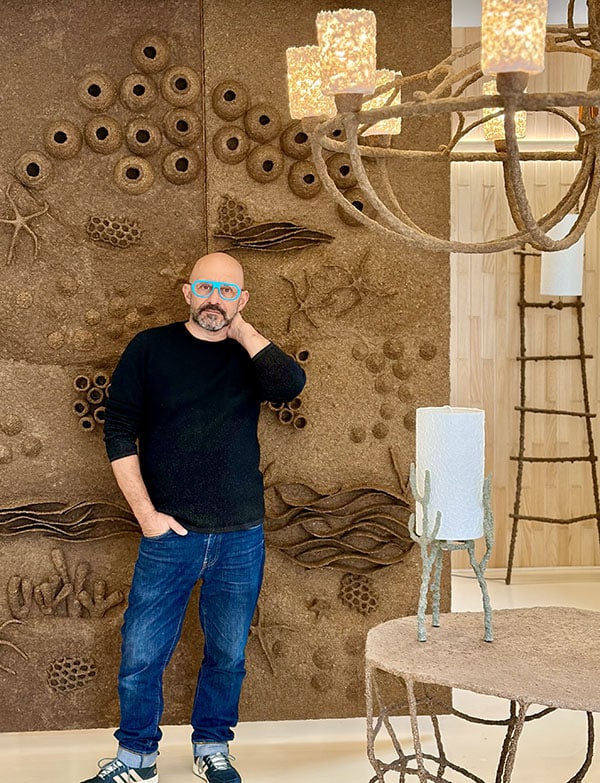 Il a su faire évoluer son travail de designer en puisant son inspiration des paysages marins. Né et grandi au Havre, ville portuaire où la mer rythme le quotidien, il a été marqué par l’appel du large et les horizons infinis. Après avoir posé ses valises à Barcelone, il a transformé ces paysages en une source d’inspiration majeure : « les flots ondulants, les vagues irisées, les tempêtes soudaines, le sable nacré et les galets roulants ». Sur des structures métalliques, le créateur applique du papier mâché pour transformer chaque pièce en une sculpture hors norme.